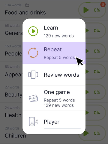 Repeats words you have already learned from the selected category.